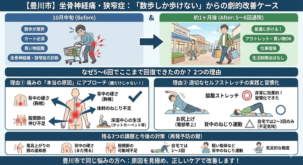 【豊川市】坐骨神経痛・脊柱管狭窄症で「数歩しか歩けない」状態から改善したケース