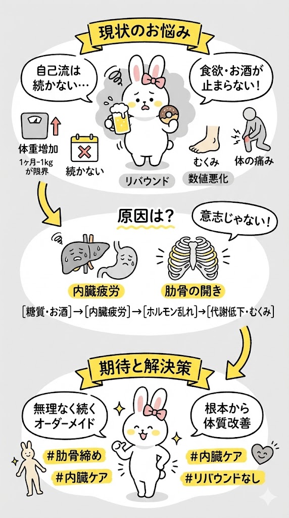 長年の食生活、睡眠不足、ストレス、飲酒、精製された砂糖。